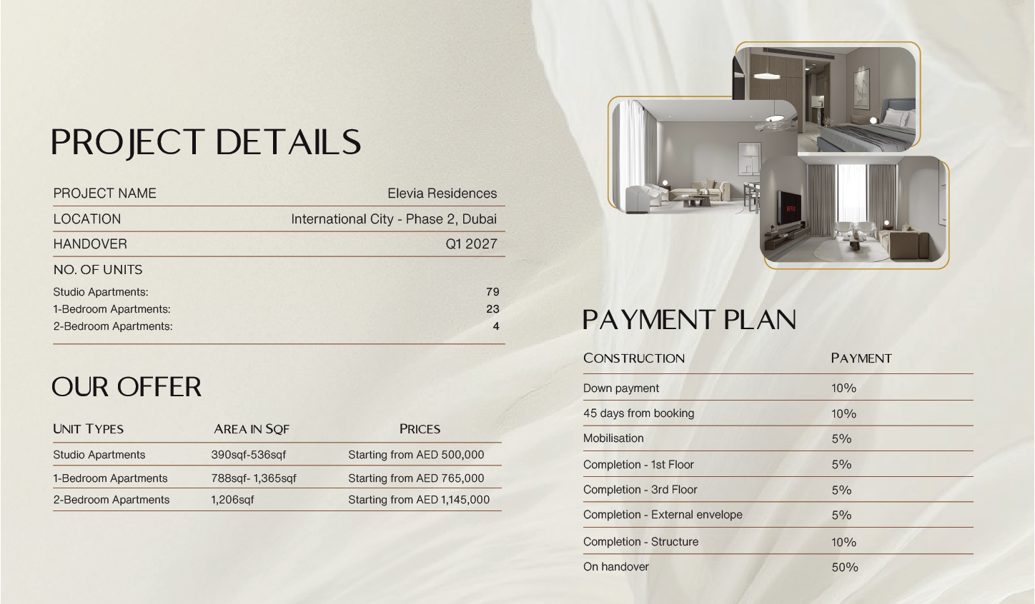پروژه ELEVIA Residences یکی از جدیدترین پروژههای مسکونی دبی است که توسط Valores Property Development در منطقه International City فاز ۲ توسعه یافته است. این پروژه با قیمت رقابتی، پلن پرداخت منعطف و موقعیت مکانی رو به رشد، گزینهای ایدهآل برای سرمایهگذاران و خریداران ملکی در دبی محسوب میشود.
